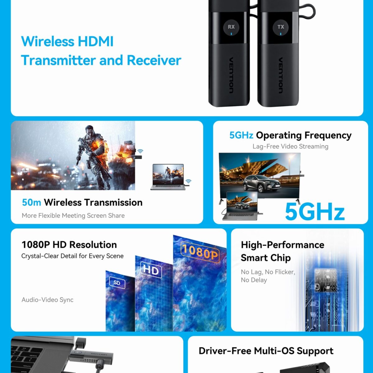 Vention Wireless HDMI Transmitter Receiver Full HD 1080P Tanpa Kabel Plug & Play 5GHz 50 Meter