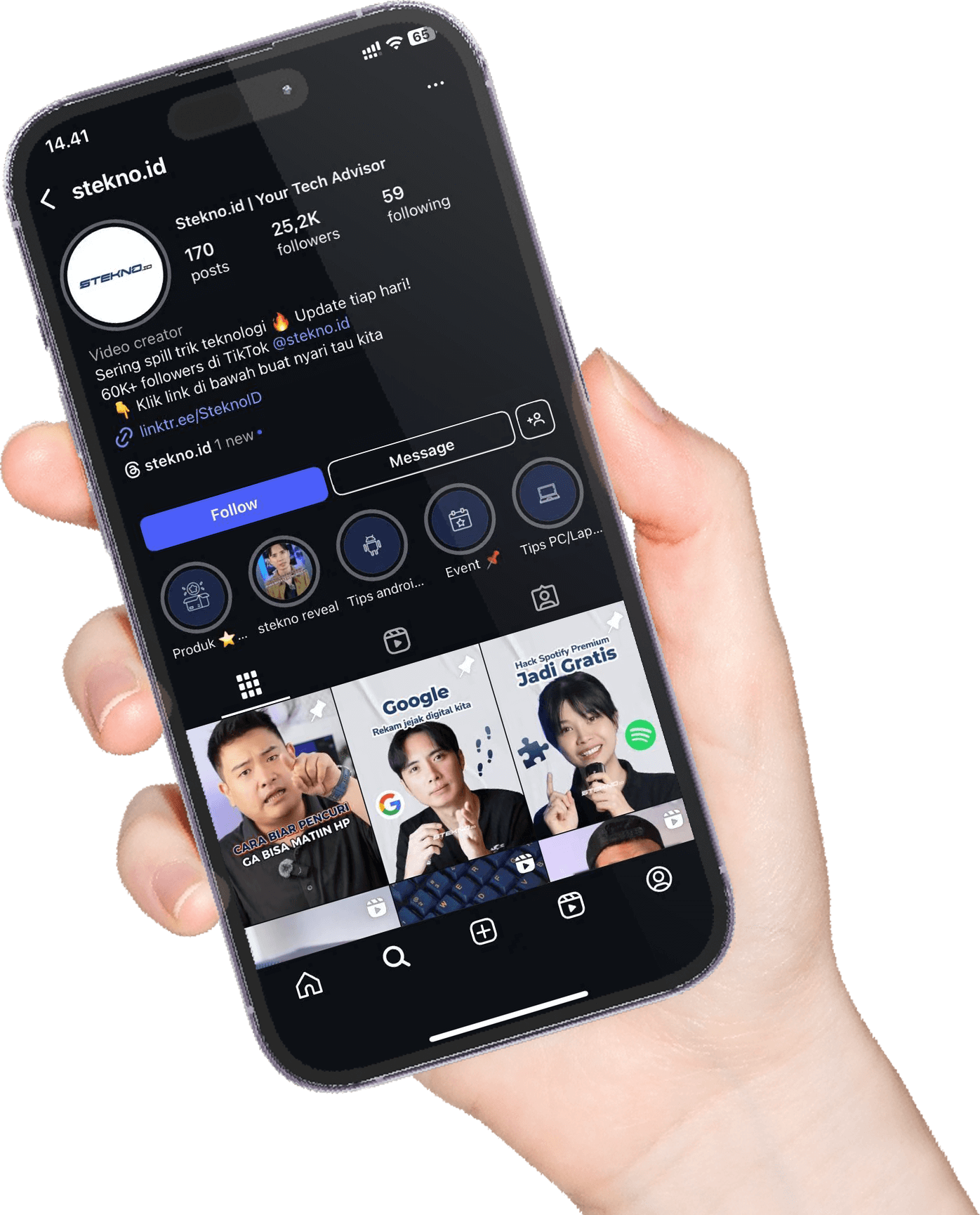 Instagram @stekno.id adalah platform utama kami dalam membangun koneksi dengan komunitas teknologi di Indonesia. Melalui kombinasi konten visual yang informatif dan engaging, kami berhasil menarik perhatian ribuan penggemar gadget, kreator konten, hingga profesional muda yang antusias terhadap inovasi digital.